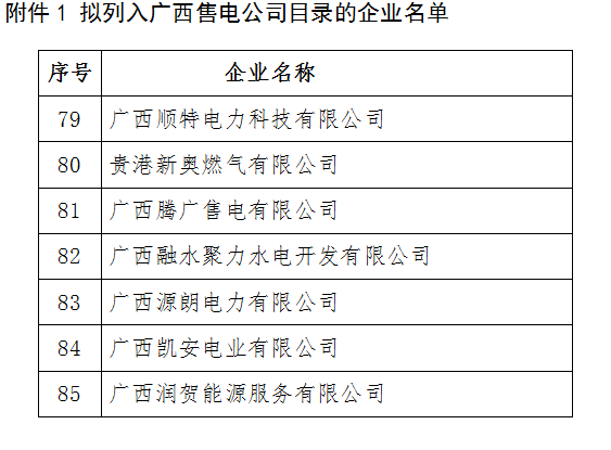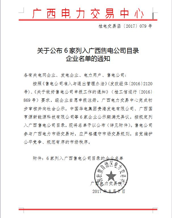 關(guān)于公布6家列入廣西售電公司目錄企業(yè)名單的通知