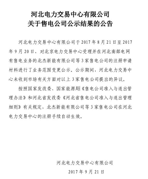 2017年9月21日,河北電力交易中心公布3家業(yè)務范圍變更的售電公司公示結果。2017年8月21日至2017年9月20日,河北電力交易中心有限公司對北京電力交易中心受理并在河北南部電網(wǎng)有售電業(yè)務的北杰新能有限公司等3家售
