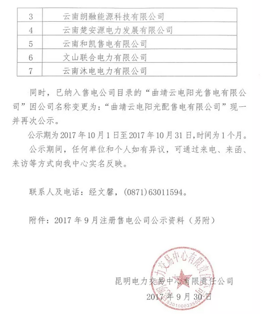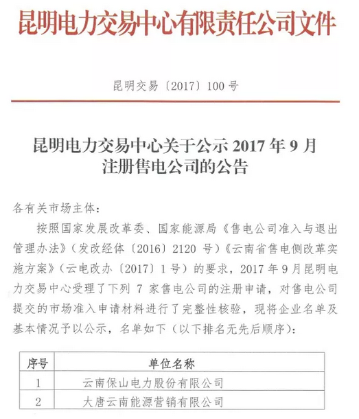 2017年9月30日,昆明電力交易中心發(fā)布關(guān)于公示2017年9月注冊(cè)售電公司的公告。按照國(guó)家發(fā)展改革委、國(guó)家能源局《售電公司準(zhǔn)入與退出管理辦法》(發(fā)改經(jīng)體[2016]2120號(hào))《云南省售電側(cè)改革實(shí)施方案》(云電改辦[2