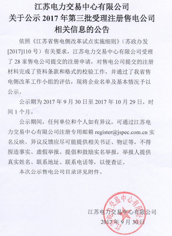 2017年9月30日,江蘇電力交易中心發(fā)布公告。江蘇電力交易中心有限公司受理了28家售電公司提交的注冊(cè)申請(qǐng),將企業(yè)名單及基本情況予以公示,公示期為2017年9月30日至2017年10月29日。至此江蘇電力交易中心9月已公示