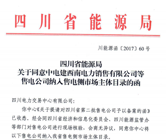 小編從四川電力交易中心獲悉,四川能源局日前發(fā)布了關(guān)于同意中電建西南電力銷售有限公司等售電公司納入售電側(cè)市場主體目錄的函。經(jīng)會同四川省經(jīng)濟和信息化委員會、四川能源監(jiān)管辦等部門對售電公司進行現(xiàn)場核驗,