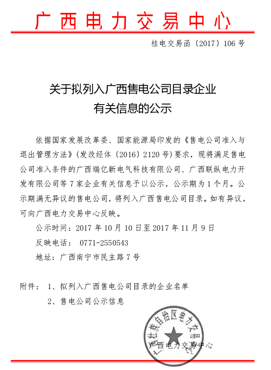 2017年10月10日,廣西電力交易中心發(fā)布《關(guān)于擬列入廣西售電公司目錄企業(yè)有關(guān)信息的公示》。將滿足售電公司準入條件的廣西瑞億新電氣科技有限公司、廣西聯(lián)縱電力開發(fā)有限公司等7家企業(yè)有關(guān)信息予以公示,公示期為1個月。