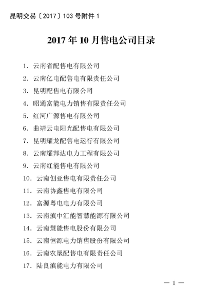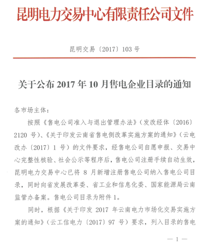 2017年10月11日,昆明電力交易中心公布了2017年10月售電公司目錄,8月份新增曲靖市創(chuàng)興電力銷售有限公司、云南茗晟售電有限公司等5家售電公司列入目錄。至此云南省售電公司已增至61家。云南省配售電有限公司等29