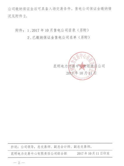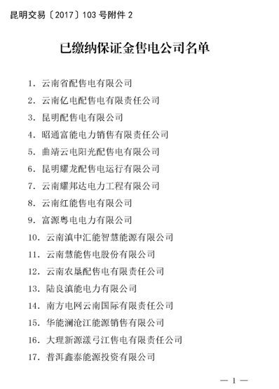 2017年10月11日,昆明電力交易中心公布了2017年10月售電公司目錄,8月份新增曲靖市創(chuàng)興電力銷售有限公司、云南茗晟售電有限公司等5家售電公司列入目錄。至此云南省售電公司已增至61家。云南省配售電有限公司等29家售電公司已繳納保證金。