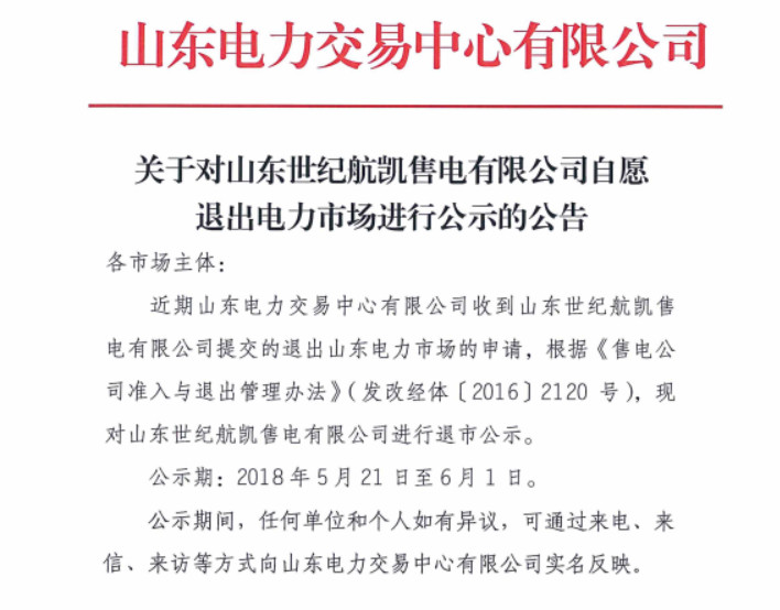 5月21日,山東電力交易中心發(fā)布了山東世紀航凱售電有限公司自愿退出電力市場的公示公告,這距離廣東售電公司退出事件僅一個星期,正如我們所預(yù)見的一樣,這樣的退出公司會越來越多。