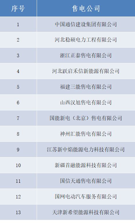 正在公示的13家售電公司名單如下: