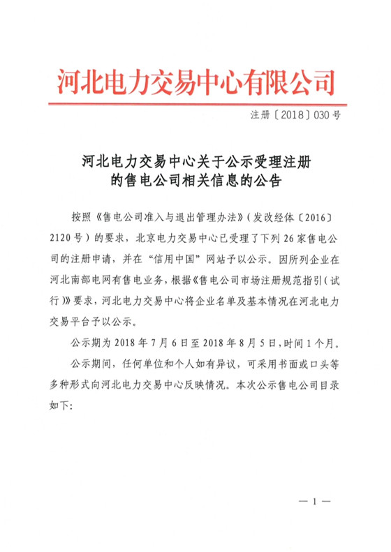 河北電力交易中心發(fā)布了北京電力交易中心推送的26家售電公司受理注冊公示的公告,中國通信建設(shè)集團(tuán)有限公司等26家售電公司注冊申請,公示期
