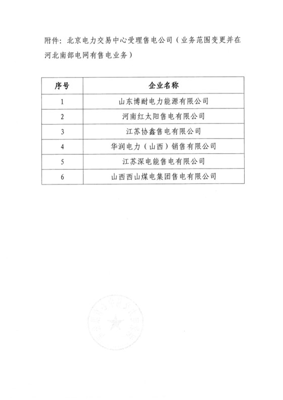 河北電力交易中心發(fā)布了北京電力交易中心推送的6家售電公司公示結(jié)果的公告,對北京電力交易中心推送的山東博耐電力能源有限公司等6家售電公