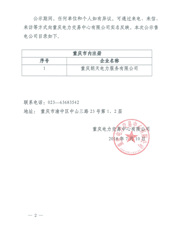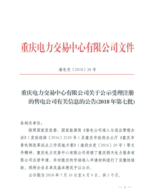 重慶電力交易中心日前發(fā)布了《重慶電力交易中心有限公司關于公示受理注冊的售電公司有關信息的公告(2018年第七批)》,公示1家售電公司。公示期為2018年7月10日至8月9日,共一個月。