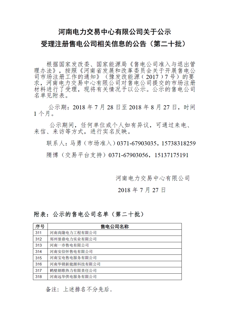 河南電力交易中心日前發(fā)布了《河南電力交易中心有限公司關(guān)于公示受理注冊(cè)售電公司相關(guān)信息的公告(第二十批)》,河南尚隆電力工程有限公司等8家售電公司在河南電力交易中心有限公司對(duì)售電公司提交的市場(chǎng)注冊(cè)材料進(jìn)行了受理,現(xiàn)將有關(guān)情況子以公示。公示期:2018年7月28日至2018年8月27日,時(shí)間1個(gè)月。詳情如下:
