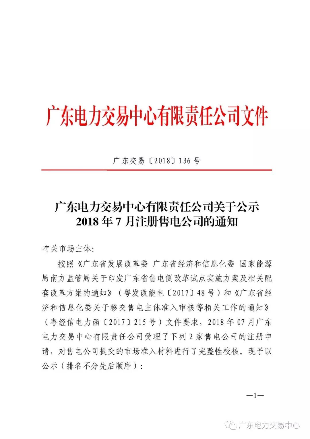 通知 | 廣東關于公示2018年07月注冊售電公司的通知