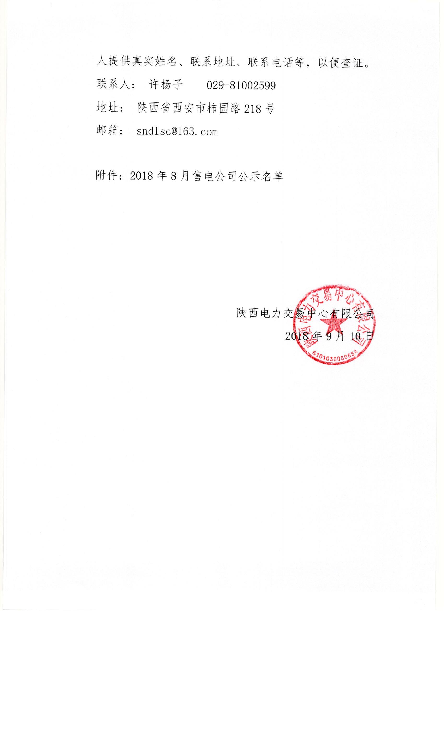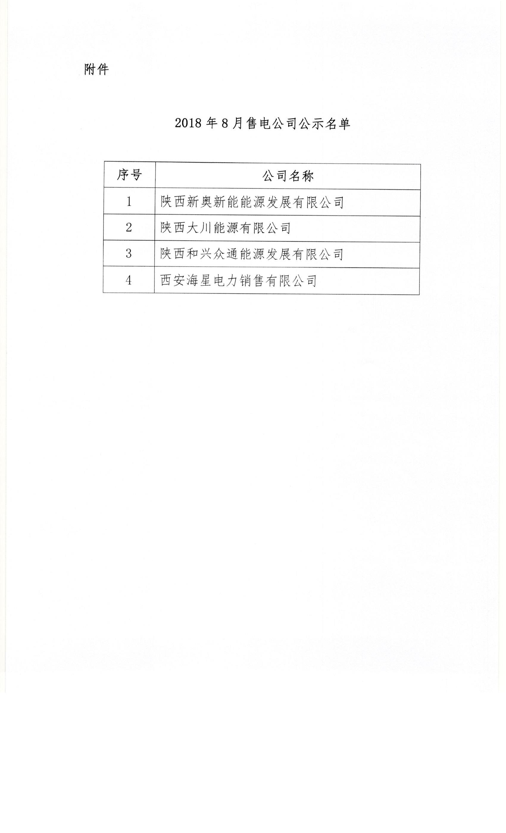 陜西電力交易中心日前發(fā)布了《陜西電力交易中心有限公司關于公示2018年8月受理注冊的售電公司相關信息的公告》,陜西電力交易中心有限公司受理了陜西新奧新能能源發(fā)展有限公司等4家售電公司提交的注冊申請,對售電公司提交的申請材料進行了完整性校驗?,F(xiàn)將企業(yè)名單及基本情況予以公示。公示期:2018年9月10日至2018年10月9日,時間1個月。詳情如下: