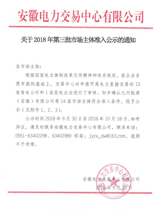 安徽電力交易中心日前發(fā)布了《關(guān)于2018年第三批市場(chǎng)主體準(zhǔn)入公示的通知》,公示13家售電公司和1家發(fā)電企業(yè)。公示時(shí)間2018年9月30日至2018年10月18日。