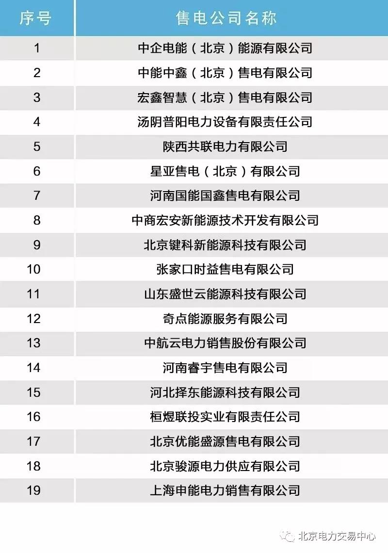 10月8日,北京電力交易中心發(fā)布了售電公司公示結(jié)果公告。按照國家發(fā)展改革委、國家能源局《售電公司準(zhǔn)入與退出管理辦法》有關(guān)規(guī)定,中企電能(北京)能源有限公司等19家售電公司公示無異議,在北京電力交易中心的注冊(cè)自動(dòng)生效。