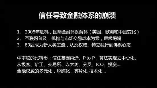 我簡單說一下歷史,為什么區(qū)塊鏈這么火?是有社會背景的,有三個,第一08年金融危機(jī)以后,導(dǎo)致國際金融體系迅速崩潰,全世界不相信美國,不相信華爾街了,歐洲也不行了,導(dǎo)致全世界的世界金融秩序的質(zhì)疑,這是區(qū)塊鏈大發(fā)展的最主要的原因。第二,互聯(lián)網(wǎng)普及了,有了互聯(lián)網(wǎng)交易成本便為0,沒有什么層級,任何偉大的思想不用通過教授、教師、學(xué)生,所以鄧迪他們比我強(qiáng),鄧迪是我的老師,我四年前認(rèn)識他,他給我講元寶幣,我經(jīng)常向他學(xué)習(xí),他們這批80后能夠帶我們玩兒那是我們的榮幸,你還能感受到市場前沿,否則根本不帶你玩了。我們當(dāng)年像他這個歲數(shù)的時候,看著50多歲的人壓著我們心里也是很蹉火。第三,80后是現(xiàn)在的主力,他們是反權(quán)威,特立獨行,90后是佛系社會。很多人投資加密幣,是風(fēng)險投資的心態(tài),他們比我們這一代有錢,有選擇能力和承擔(dān)風(fēng)險能力。不必太替他們操心,許多人一下虧了幾十萬,無非是被割韭菜的快感。我們苦口婆心說他,他要嘗試,要失敗,這個心態(tài)完全重要,我們要聽他們的,在座現(xiàn)在有很多老板都知道,我們的孩子都比我們強(qiáng),確實是這樣。