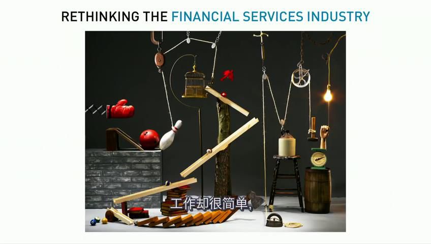 金融服務(wù)業(yè)。你是否能認出這是什么?小題大做的機器。這臺機器離奇的復(fù)雜,工作卻很簡單,就像敲碎雞蛋或是關(guān)上門等。老實說,它使我想起了金融服務(wù)業(yè),我的意思是,你在街角的商店刷了卡,一股比特流便穿過了好幾家公司,每一家都有自己的計算機系統(tǒng),其中還有一些是20世紀70年代的主機,甚至比在座的各位還要老,然后三天過后,清算才發(fā)生。好吧,金融業(yè)有了區(qū)塊鏈,將不再會有清算,因為交易和清算是同一種行為,它只是改變賬本。所以在華爾街或世界上所有的地方,金融業(yè)正在巨變,思考著自己是否會被取代,或是如何正視技術(shù)迎接成功?