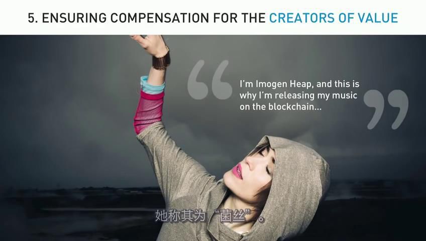 就拿音樂來說,音樂家們只在食物鏈的末端獲得一些殘渣碎屑。在25年前,如果你是一個作曲家,寫出一首流行的歌曲,賣出一百萬首單曲,你可以獲得大約45000美元的報酬。而現(xiàn)在,作曲家的你寫出一首流行的歌曲,被百萬次播放,你并不能得到45000美元,你只能得到36美元,足以買一個不錯的披薩了。所以伊莫金·希普一位榮獲格萊美獎的創(chuàng)作歌手,現(xiàn)在把音樂發(fā)表在一個區(qū)塊鏈的生態(tài)系統(tǒng)上,她稱其為“菌絲”,其中的音樂有著智能協(xié)議,音樂保護著她的知識產(chǎn)權(quán),你想要聽歌嗎?它是免費的,或者會有幾分錢流入數(shù)字賬戶,如果想要在電影中使用這首歌,那就是另外價格,知識產(chǎn)權(quán)都有詳細的說明。你想作為手機鈴聲?那也是另外一個價格。她描述到,歌曲成為了商業(yè),在這個平臺上歌曲實現(xiàn)了商業(yè)化,保護了作者的權(quán)利。并且因為歌曲采用了一種類似于銀行賬戶的支付系統(tǒng),所有的錢都會到藝術(shù)家的手中,他們掌控了行業(yè),而不是由那些強大的中間商所控制。現(xiàn)在,不僅僅是歌曲作家,任何形式的創(chuàng)作活動,比如美術(shù)、發(fā)明、科學(xué)發(fā)現(xiàn)、新聞記者各行各業(yè)沒有得到公平報酬的人,而有了區(qū)塊鏈,他們將在區(qū)塊鏈上得到巨大收益,那樣可真棒。