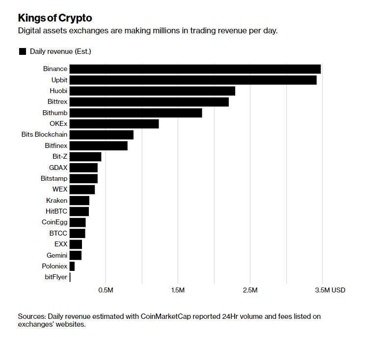 上圖反映了知名虛擬貨幣交易平臺(tái)的日營(yíng)收排名情況,Binance和Upbit的日營(yíng)收已達(dá)近350萬(wàn)美元