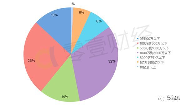注冊資本在0到100萬的公司占13%,100萬到500萬與1000萬到5000萬的占比較大,分別為35%和25%,兩者的和占到全部的一半多,500萬到1000萬的占到了17%。