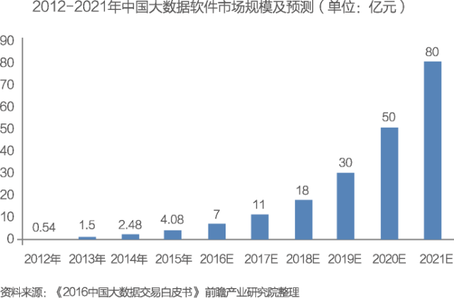 就中國大數(shù)據(jù)市場而言,大數(shù)據(jù)軟件市場占比較小。2012年,大數(shù)據(jù)軟件市場規(guī)模約為0.54億元,2014年市場規(guī)模約為2.48億元,前瞻預(yù)測,2016-2021年,中國大數(shù)據(jù)軟件市場規(guī)模年均復(fù)合增長率約為65%。預(yù)計到2021年,其市場規(guī)模達(dá)到80億元。