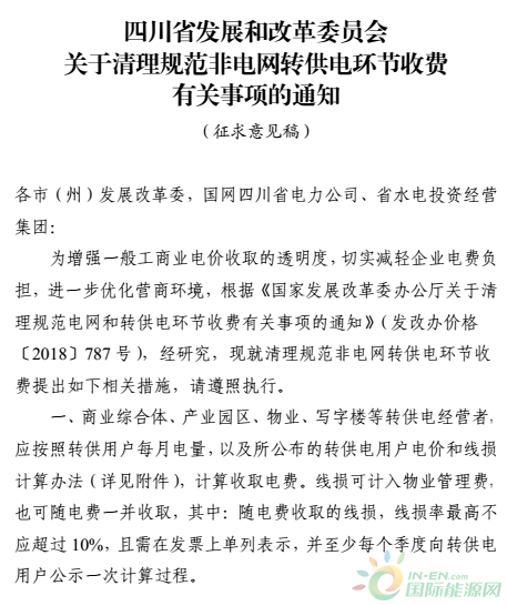 為進(jìn)一步降低一般工商業(yè)電價,減輕企業(yè)電費負(fù)擔(dān),根據(jù)國家發(fā)展改革委關(guān)于清理規(guī)范電網(wǎng)和轉(zhuǎn)供電環(huán)節(jié)收費有關(guān)工作安排部署,我們研究起草了《四川省發(fā)展和改革委員會關(guān)于清理規(guī)范非電網(wǎng)轉(zhuǎn)供電環(huán)節(jié)收費有關(guān)事項的通知(征求意見稿)》(以下簡稱《通知》)?,F(xiàn)將《通知》通過省發(fā)展改革委網(wǎng)站于7月26日—8月3日向社會公示,各地價格主管部門可組織本地非電網(wǎng)轉(zhuǎn)供電企業(yè)或用戶(租戶)討論,若有意見,請書面反饋我委(資源和環(huán)境價格處)。