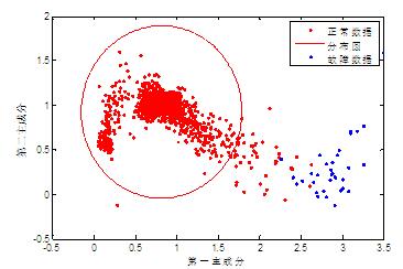 由圖2-4到圖2-6可以看出,在三個(gè)轉(zhuǎn)速范圍,故障數(shù)據(jù)的PCA降維結(jié)果與正常數(shù)據(jù)降維結(jié)果的分布有很大的差別,故障數(shù)據(jù)降維后的散點(diǎn)都落在分布圓外,可以實(shí)現(xiàn)正常數(shù)據(jù)與故障數(shù)據(jù)的分類。因此,結(jié)合PCA降維技術(shù),考慮風(fēng)電運(yùn)行工況,對(duì)風(fēng)電振動(dòng)數(shù)據(jù)進(jìn)行融合,獲得散點(diǎn)分布圓,可以有效的實(shí)現(xiàn)風(fēng)電設(shè)備的狀態(tài)監(jiān)測(cè)和故障診斷。