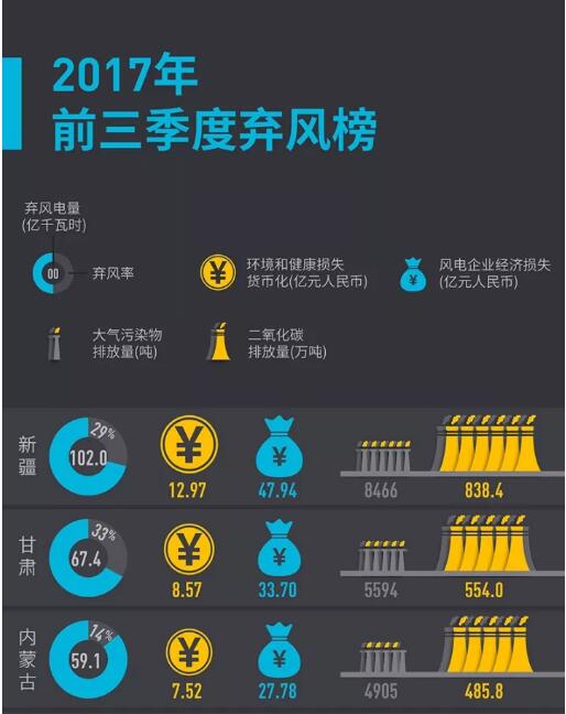 綜觀2017年前三季度數(shù)據(jù),新疆、甘肅和內(nèi)蒙古是棄風量最高的三個省區(qū),占全國棄風總量的77%。其中,甘肅和新疆的棄風率分別為33%和29.3%,列居全國前兩名。綠色和平根據(jù)官方發(fā)布的火電排放數(shù)據(jù)和風電價格計算,這三個省區(qū)前三季度由于棄風造成的環(huán)境和健康損失估計為29億人民幣左右,碳排放約1878萬噸,風電企業(yè)經(jīng)濟損失約109億元人民幣。