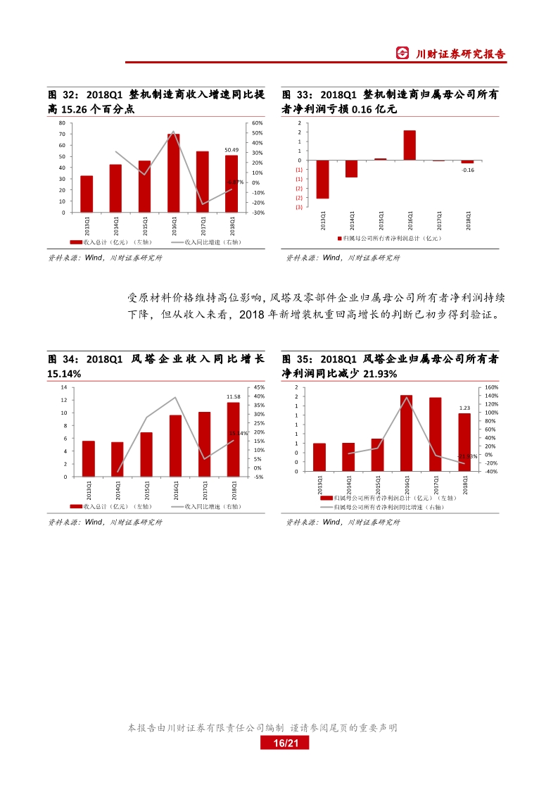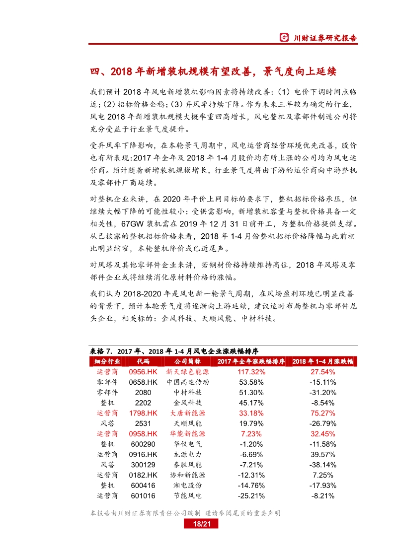 2017 年業(yè)績分化,運營商盈利顯著改善2017 年我國新增并網、吊裝裝機分別同比下滑 22 12%、16 22%,棄風率有所下降,全年風電發(fā)電量 30