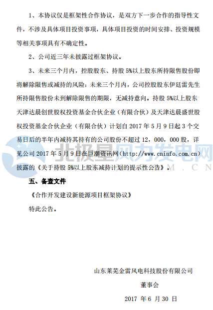 金雷風電2017 年 6 月 29 日與山東省萊蕪市鋼城區(qū)人民政府在萊蕪市鋼城區(qū)簽訂了《合作開發(fā)建設(shè)新能源項目框架協(xié)議》,為充分利用鋼城區(qū)轄區(qū)內(nèi)豐富的風能資源,促進當?shù)亟?jīng)濟快速發(fā)展,雙方本著平等互惠、共同
