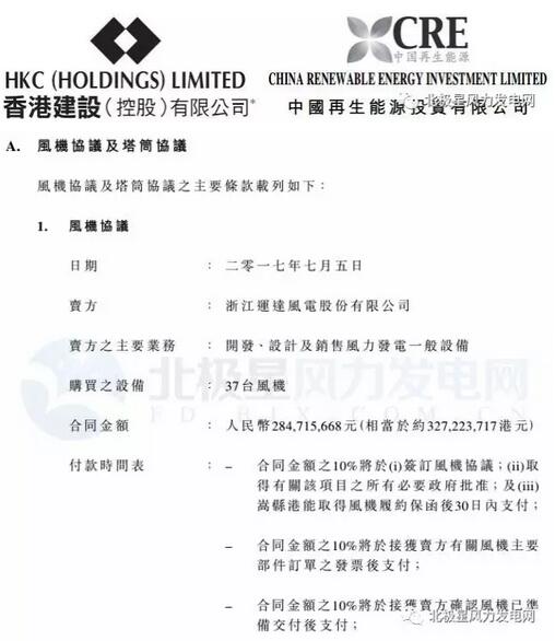 香港上市公司中國再生能源投資有限公司子公司嵩縣港能近日分別與浙江運(yùn)達(dá)風(fēng)電股份有限公司和山東中車同力鋼構(gòu)有限公司簽訂風(fēng)電設(shè)備購買協(xié)議,協(xié)議總金額達(dá)3.32億元。