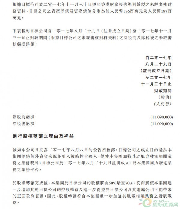 北控清潔能源集團(tuán)公布,2018年1月10日,公司全資附屬冠南(香港)作為買方,擬以零代價(jià)向宏業(yè)(香港)、建暉(香港)收購北控風(fēng)力發(fā)電有限公司(“目標(biāo)公司”)20%的股權(quán)。
