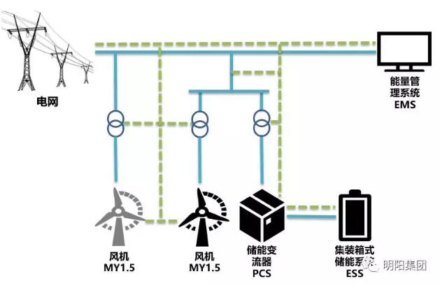 分布式能源系統(tǒng)讓能源生產靠近需求側,根據不同場景的需求變化平衡能源供給與使用,滿足多重目標的中、小型能量轉換利用,實現(xiàn)了更加清潔、智慧、靈活和高效的能量生產和消費方式,為我國能源結構的戰(zhàn)略性優(yōu)化和能源供給側結構改革提供了重要解決途徑。大慶中丹風機儲能智能發(fā)電系統(tǒng)主要由風力發(fā)電機組(MY1.5)、儲能變流器(PCS)、集裝箱式儲能系統(tǒng)ESS、箱式變壓器、配電系統(tǒng)、能量管理系統(tǒng)(EMS)以及電網等單元組成。