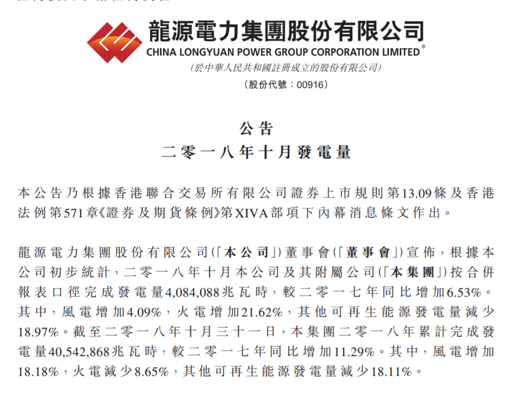 龍源電力公布10月份風(fēng)電發(fā)電量,據(jù)公告顯示,2018年10月份公司總發(fā)電量達40 84億度電,較2017年同比增加6 53%,其中風(fēng)電33 09億元發(fā)電量,增加4 09%。
