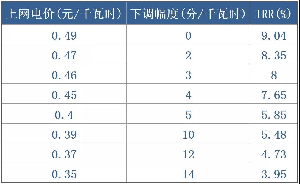 圖表:上網(wǎng)電價(jià)下調(diào)與項(xiàng)目IRR測(cè)算