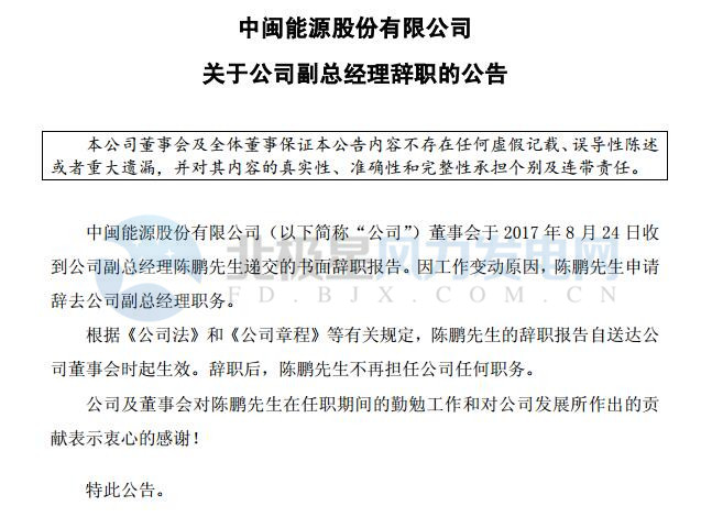 中閩能源副總經(jīng)理陳鵬近日因工作變動辭職,不再擔(dān)任中閩能源任何職務(wù)。