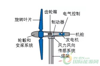 風(fēng)電即用風(fēng)力發(fā)電,也就是把風(fēng)的動能轉(zhuǎn)變成電能。風(fēng)力發(fā)電機組一般由風(fēng)輪、齒輪箱、發(fā)電機、塔架、電氣控制系統(tǒng)和儲能裝置等構(gòu)件組成。風(fēng)輪是風(fēng)電機組最主要的部件之一,由槳葉和輪轂組成。槳葉具有良好的動力外形,就像風(fēng)車一樣,可以將風(fēng)能轉(zhuǎn)化為機械能,旋轉(zhuǎn)的風(fēng)輪再通過齒輪箱增速驅(qū)動發(fā)電機,進而將機械能轉(zhuǎn)化為電能。