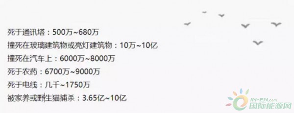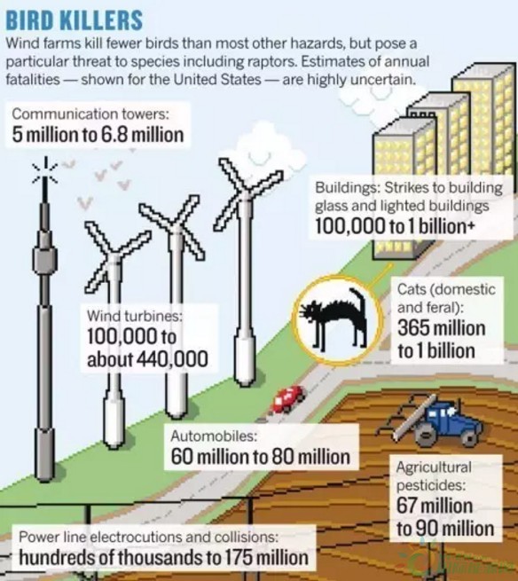 據(jù)美國(guó)漁業(yè)與野生動(dòng)物協(xié)會(huì)統(tǒng)計(jì),在美國(guó)平均每年有10萬(wàn)到44萬(wàn)只鳥類因撞到風(fēng)機(jī)而死亡,看起來(lái)是個(gè)不小的數(shù)字,但是如果和其他的死亡數(shù)字來(lái)比較: