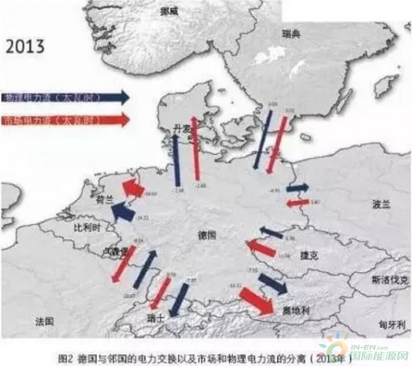 德國南北區(qū)域間存在著越來越嚴重的網(wǎng)絡(luò)阻塞,也存在多種互斥的解決方案。北部具有大量風電,以及依靠進口煤炭的煤電廠或者廉價褐煤電廠。相比而言,德國南部的天然氣、核電(因為CO2 價格過低)與煤電(需要內(nèi)河運輸成本)的成本就顯得高昂了。這種情況下,即使物理上南部并不缺少電力裝機,但是在最小成本調(diào)度、整個德國是一個價格體系,傳輸容量限制的情況下,負荷與供應(yīng)地區(qū)不平衡的情況仍舊是存在的。因此,目前對鄰國,特別是波蘭、捷克等國網(wǎng)絡(luò)的借用來實現(xiàn)電力物理平衡的趨勢在增強(見圖2)。擴大南北電網(wǎng)高壓傳輸容量(電網(wǎng)公司建議的400 千伏、800 千米線路),建設(shè)備用電廠,都可能成本高昂,并遭到了本地居民的強烈反對,短期內(nèi)完全不可能。而將定價區(qū)進一步分割成為其他的備選方案。