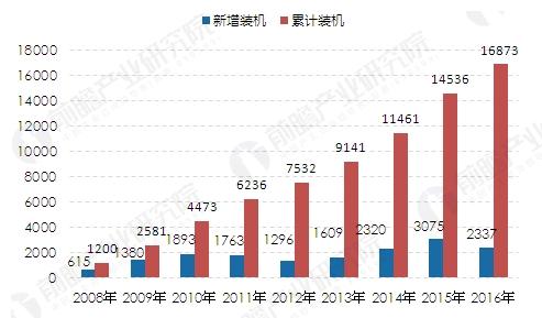 2008-2016年中國新增及累計風電裝機容量(單位:萬千瓦)