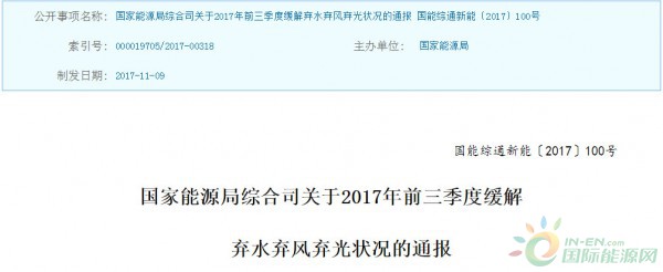 國(guó)家能源局綜合司關(guān)于2017年前三季度緩解棄水棄風(fēng)棄光狀況的通報(bào)