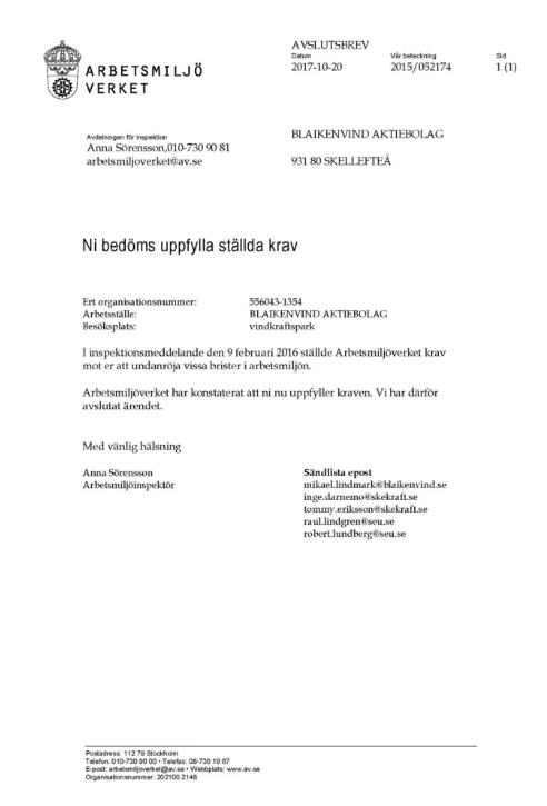 近日,瑞典傳回好消息:瑞典工作環(huán)境管理署(以下簡稱“環(huán)境署”)通知BlaikenVind,東方風力發(fā)電機組滿足了所有要求。這意味著之前在Blaiken風場的東方風力發(fā)電機組上檢查出的所有缺陷和不足已全部完成整改,并滿足瑞典環(huán)境署要求。