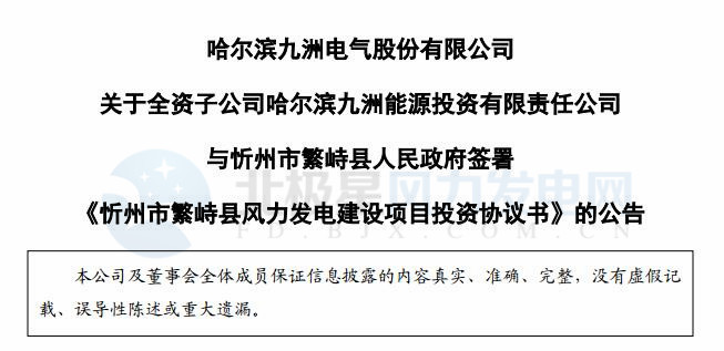 九洲電氣全資子公司簽署2個風電項目共300MW 總投資30億元