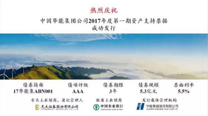 11月24日,中國華能2017年度第一期資產(chǎn)支持票據(jù)在銀行間市場順利發(fā)行,該項目是我國首單以可再生能源電費補貼款為基礎(chǔ)資產(chǎn)的資產(chǎn)證券化產(chǎn)品。本期項目由中國華能發(fā)起,光大證券和農(nóng)業(yè)銀行為主承銷商,華能貴誠信