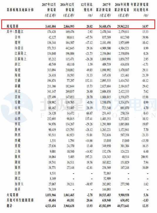 龍源電力2017年12月風(fēng)電發(fā)電量34.41億千瓦時 同比增加20.02%