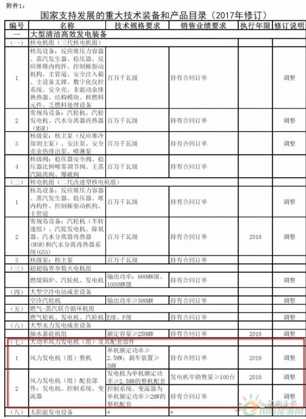 2017年12月底,財政部會同發(fā)展改革委、工業(yè)和信息化部、海關(guān)總署、稅務(wù)總局、能源局共同印發(fā)了《關(guān)于調(diào)整重大技術(shù)裝備進(jìn)口稅收政策有關(guān)目錄的通知》。昨天(2018年1月8日),財政部發(fā)布了六部門印發(fā)《關(guān)于調(diào)整重大技術(shù)裝備進(jìn)口稅收政策有關(guān)目錄的通知》,對該政策的三份目錄進(jìn)行了調(diào)整。政策附件中涉及對大功率風(fēng)力發(fā)電機(jī)組及其配套部件的調(diào)整。