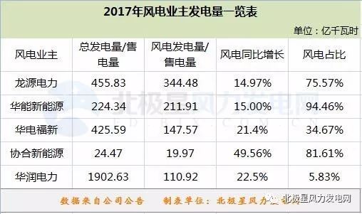 近期龍源電力、華能新能源、華電福新、華潤電力、協(xié)合新能源相繼曬出了2017年風(fēng)電成績單。以下為具體數(shù)據(jù):注:國投電力、節(jié)能風(fēng)電、大唐新