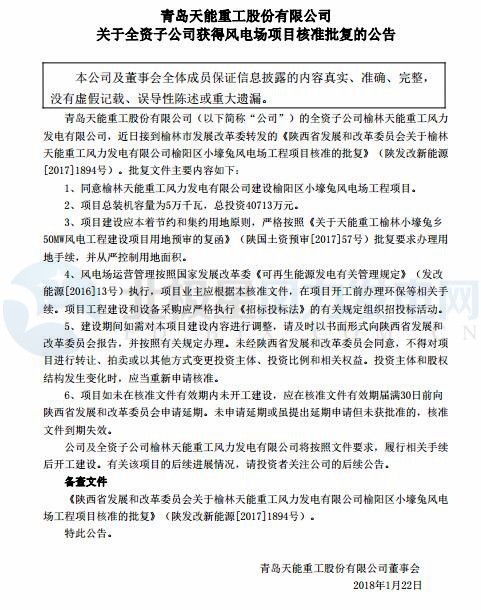 近日,青島天能重工股份有限公司的全資子公司榆林天能重工風力發(fā)電有限公司接到《陜西省發(fā)展和改革委員會關于榆林天能重工風力發(fā)電有限公司