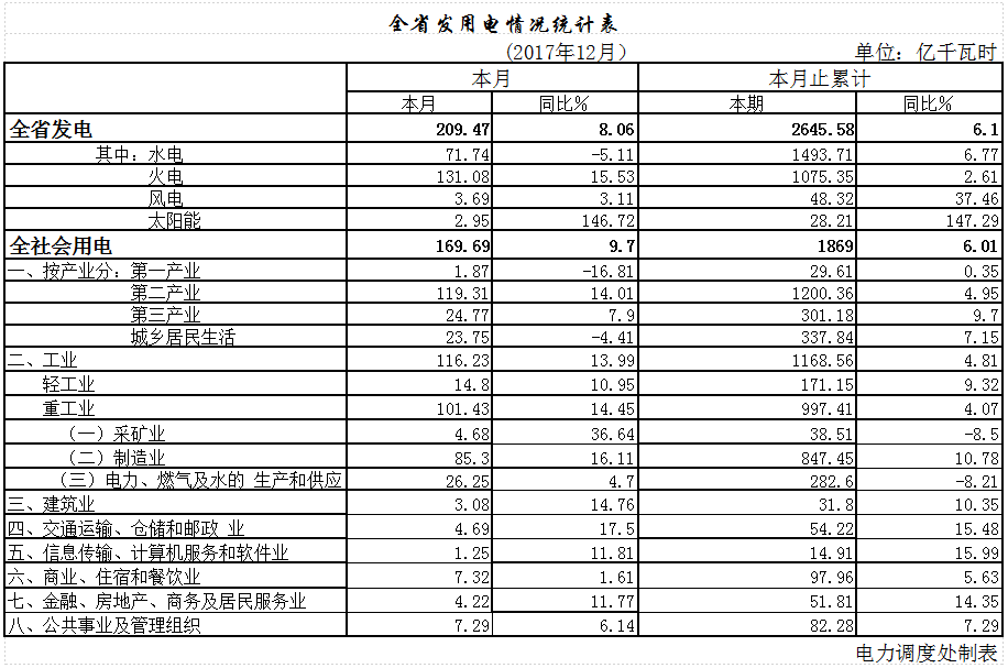 2017年,全省用電需求持續(xù)穩(wěn)定增長,各大產(chǎn)業(yè)和城鄉(xiāng)居民生活用電全面增長。全省電力戰(zhàn)線認(rèn)真貫徹落實五大發(fā)展理念,以確保全省電力供應(yīng)為中心,以降成本、惠民生為重點,團(tuán)結(jié)協(xié)作,克難奮進(jìn),確保了全省電網(wǎng)安全穩(wěn)定運行和電力正常供應(yīng),為全省經(jīng)濟(jì)社會發(fā)展提供了堅強的電力支撐。截止年底,全省全口徑裝機容量7124.48萬千瓦,同比增長5.62%;全年發(fā)電量2645.58億千瓦時,增長6.10%;全社會用電量1869.00億千瓦時,增長6.01%,其中工業(yè)用電量1168.59億千瓦時,增長4.81%。