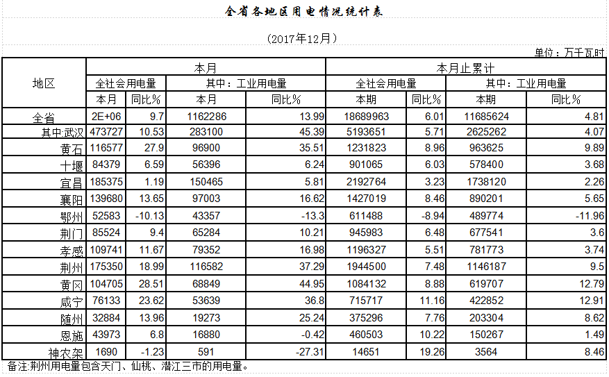 (五)全省各地區(qū)用電普遍增長,“一主兩副”城市增速穩(wěn)健。全省14個用電統(tǒng)計地區(qū)中,武漢等13個地區(qū)全社會用電同比增長,其中咸寧、恩施、神農(nóng)架林區(qū)3地全社會用電增幅在兩位數(shù)以上。各地工業(yè)用電基本與全社會用電同步增長,僅鄂州市受鋼鐵行業(yè)淘汰落后產(chǎn)能影響工業(yè)用電下降。“一主兩副”城市武漢、宜昌、襄陽3市全社會用電量占到全省的47.16%,工業(yè)用電量占全省的44.63%,3市全社會和工業(yè)用電均增幅穩(wěn)健,有力促進(jìn)了全省用電的增長。