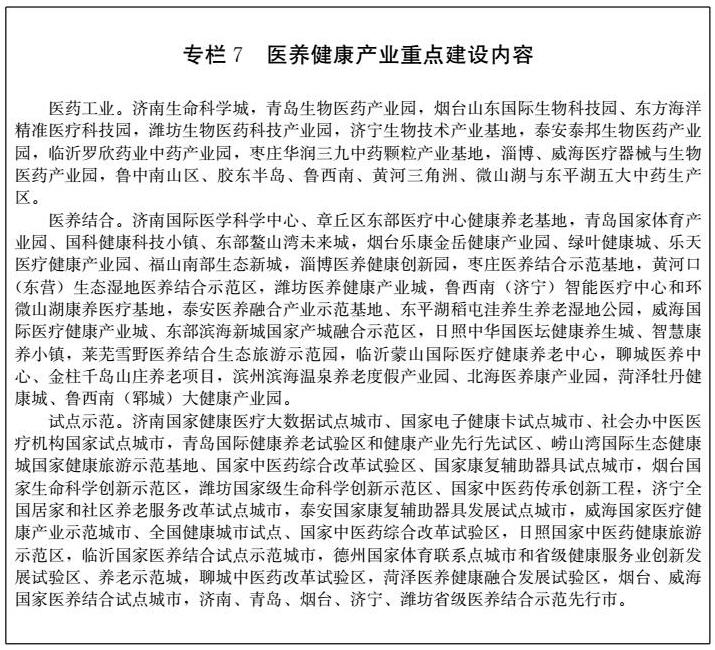 提升醫(yī)藥工業(yè)發(fā)展水平。加大創(chuàng)新藥物研發(fā)攻關(guān)力度,積極開發(fā)新劑型和新產(chǎn)品,重點發(fā)展以原料藥、化學(xué)創(chuàng)新藥、化學(xué)仿制藥和高端制劑為主的化學(xué)藥,以疫苗與診斷試劑、海洋藥物等為主的生物藥。圍繞家庭和個人醫(yī)療、保健、養(yǎng)老需求,發(fā)展數(shù)字化診療設(shè)備、健康監(jiān)測裝備、可穿戴醫(yī)療裝備、醫(yī)用機器人等新型醫(yī)療器械設(shè)備。支持醫(yī)藥企業(yè)向功能性食品、特殊醫(yī)學(xué)用途配方食品、化妝品以及保健、預(yù)防等領(lǐng)域延伸。加強中藥材種質(zhì)資源保護利用,加快推動療效確切、臨床價值高的中藥創(chuàng)新藥的研發(fā)和產(chǎn)業(yè)化。加快威海國家醫(yī)療器械技術(shù)創(chuàng)新中心、國家制造業(yè)(高性能醫(yī)療器械)創(chuàng)新中心建設(shè),支持青島、煙臺、威海建設(shè)海洋生物醫(yī)藥國家創(chuàng)新型產(chǎn)業(yè)集群,濟南、青島、濰坊、威海、臨沂、棗莊建設(shè)國家中醫(yī)藥綜合改革試驗區(qū)。